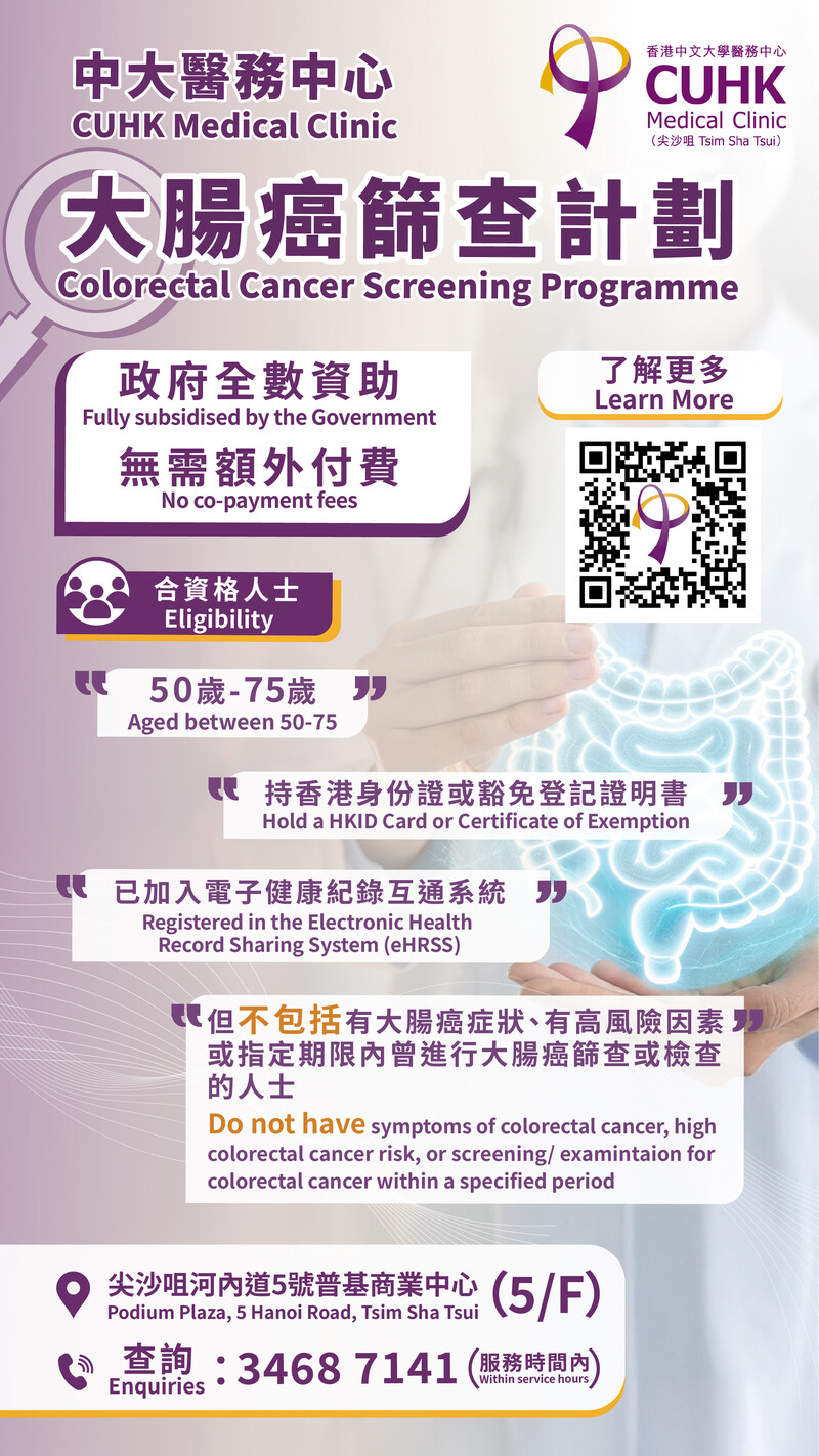 香港中文大学医务中心现正提供大肠癌筛查计划,政府全数资助 50至75岁及没有症状的香港居民,无需额外付费。参加者会首先进行大便隐血测试,检验是否有肉眼都见不到的微量血液。若有,会安排接受大肠镜检查及切除有可能出现的大肠瘜肉,避免其演变成癌症。